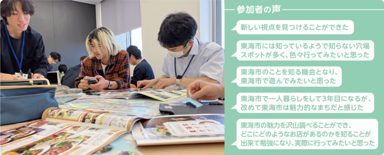 前半は、東海市を知るというテーマで、情報誌や観光ガイドブック、インターネットなどを活用して地域の魅力を再発見。後半は、前半でリサーチした観光資源を大きな地図を使いながら、日帰り旅行プランを企画。最後は、参加したメンバーの前でプレゼンテーションを行っていただきました。