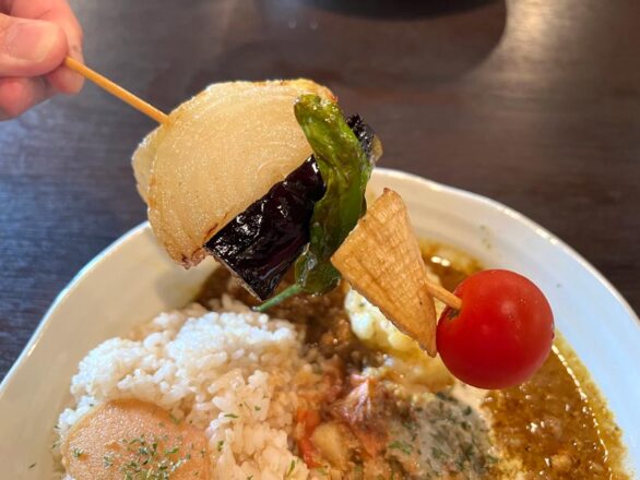 最初に目を引くのはトッピングの「野菜」。焼いた野菜が串にささっているので、
