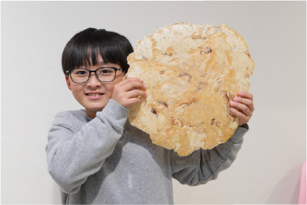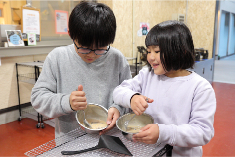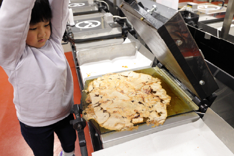 自分達で材料を混ぜて、専用の鉄板で巨大えびせんべいが焼けます。