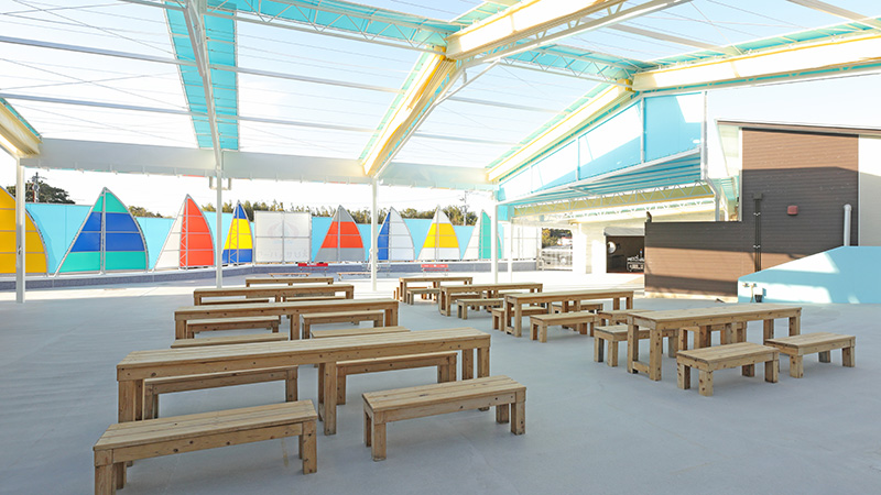 野外エリアのテラスでは、子ども連れでものびのび過ごせて最高!