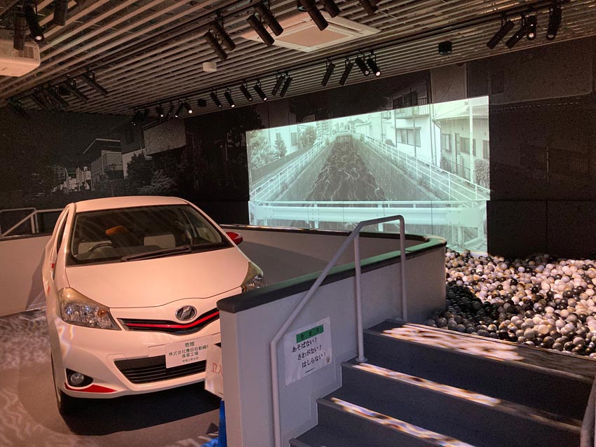 地震の揺れを客観的に見たり、揺れで停止するガスのマイコンメーターの復旧方法が学べたりする地震体験コーナーや水害時の車中で車の扉がいかに重くなるかを体験したり、冠水道路での歩行の危険性を体感する水害体験コーナーです。