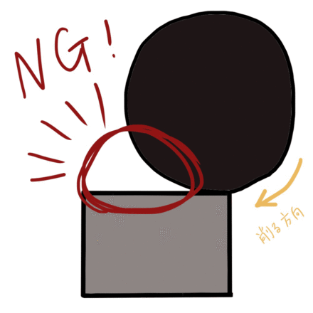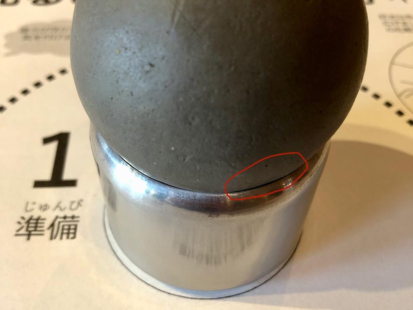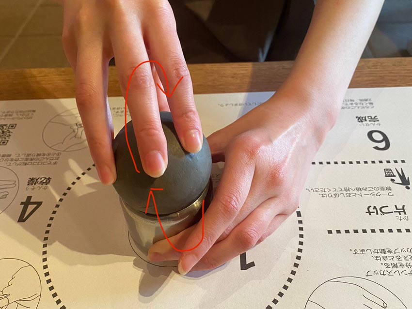 道具と粘土の間に隙間がある部分は歪みがあります。隙間がある部分を自分の正面に向けてセットし、どろだんごを支えます。どろだんごに対して垂直になるように、且つ親指が自分の前に来るように持ちます。そのまま親指を押し込むようにして、自分側にどろだんごを回して削っていきます。
