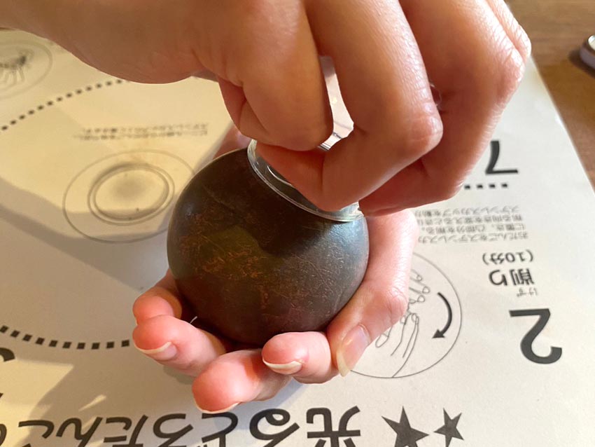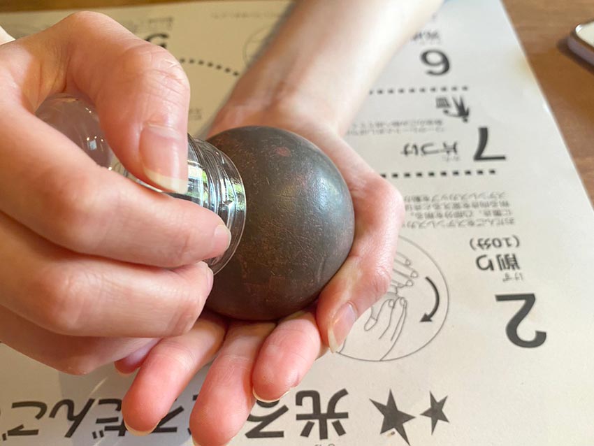 私は後半の磨きが足りなかったようで、スタッフさんに「もう少し力を入れても大丈夫ですよ」と助言をいただきました。このように瓶を使ってしっかり磨けるのは体験中だけなので、この段階でしっかり磨いておきましょう。