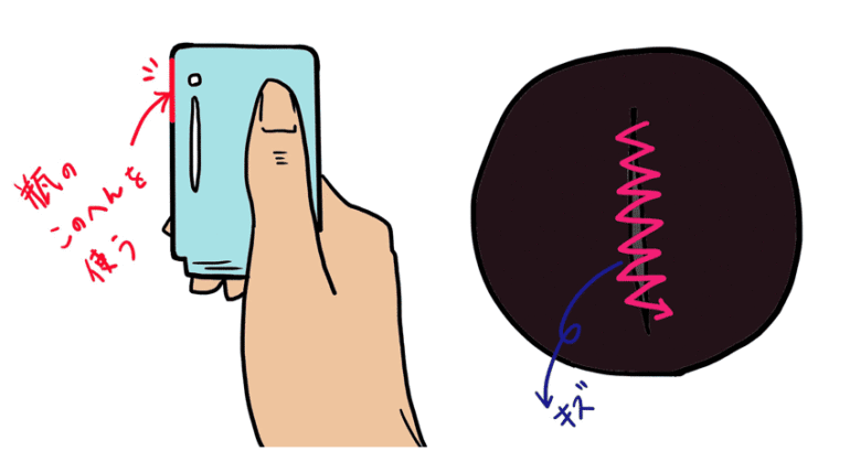 瓶の持ち方を変え、傷の上で瓶を横に小刻みに動かして撫でます。