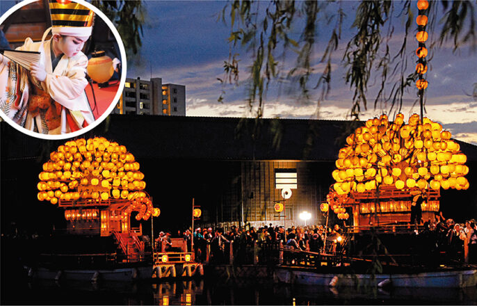 上半田のちんとろ舟2艘が半田運河に浮かびます。夜、提灯が灯される中上演される子供三番叟はまるで能の様な優美さです。