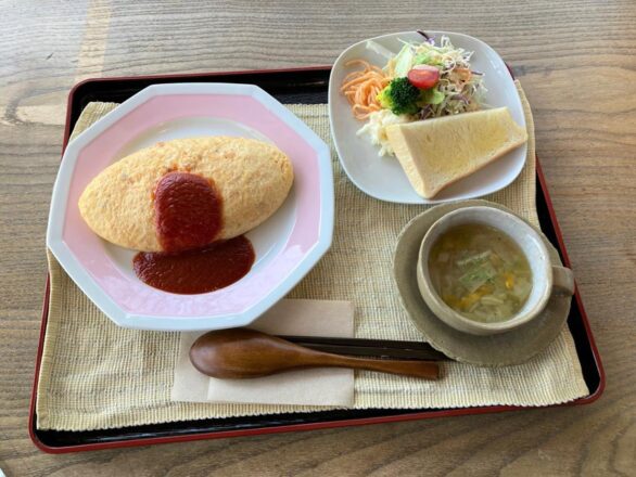 オムライスは「ファムライス」と呼ばれています。ランチのセットは「ファムライス」にスープ、サラダ、げんきの郷「郷パン」、デザート、ドリンク付き。ドリンクは自家焙煎コーヒーをチョイスしました。