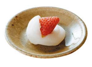 一煎目、二煎目、三煎目とお茶の味の変化も楽しめる煎茶に合わせるのは、新潟産もち米を使った羽二重餅に地元市野園芸のいちごを包んだこっくり甘いいちご大福と。1個200円