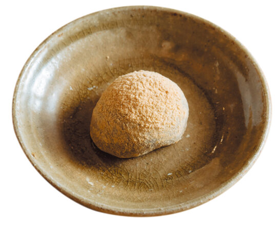 国産わらび粉を丁寧に煉り上げ、口どけのいいこし餡を包み込み、仕上げに微細粒のきな粉をまぶした秋冬限定のわらび餅。柔らかくもコシのある食感です。甘く香ばしい玄米茶をたっぷり添えて。1個212円
