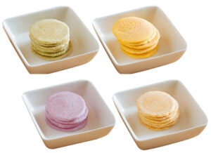 国産かぼちゃや西尾抹茶などこだわりの素材を練り込んだ素焼きのえびせんべい。えびせんべいの塩味に、まろやかなのど越しのびわ茶がよく合います。抹茶、かぼちゃ、むらさき芋、うまカレー1袋300円~