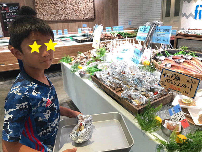 魚介のほか、小学生男子の胃袋をつかむ スペアリブや肉巻きおにぎりもあって 「肉も魚も両方食べれて最高!」と大喜び。